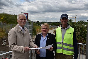 Foto v.l.n.r.: Prof. Schwarze, Norbert Schilff, namentlich unbekannter Bauarbeiter