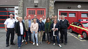 Bildunterschrift: Links: Dirk Aschenbrenner, Direktor Feuerwehr Dortmund, Mitte hinten Dirk Goosmann, ordnungspolitischer Sprecher der SPD-Ratsfraktion sowie Mitglieder der Berufsfeuerwehr, der freiwilligen Feuerwehr Dortmund und Mitglieder der SPD-Ratsfraktion