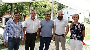 Bildunterschrift: SPD-Ratsmitglieder Martin Grohmann und Friedhelm Sohn, Volkan Baran, SPD-Landtagabgeordneter, Daniel Kunstleben, Geschäftsführer FABIDO und Frau Kliesch, Leitung der FABIDO-Kita Am Heisterbach